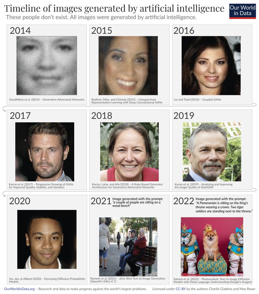 Modern AI is a product of remarkable leaps in hardware and improvements in computational power. I think the below images by Our World in Data do a great job of demonstrating this. AI systems have come far from the early days of primitive, black-and-white pixelated images and can now generate photo-realistic images from challenging prompts in seconds (Exhibit A). AI now exceeds human performance in areas like language understanding, reading comprehension, and, is at par, if not ahead on speech and handwriting recognition (Exhibit B)