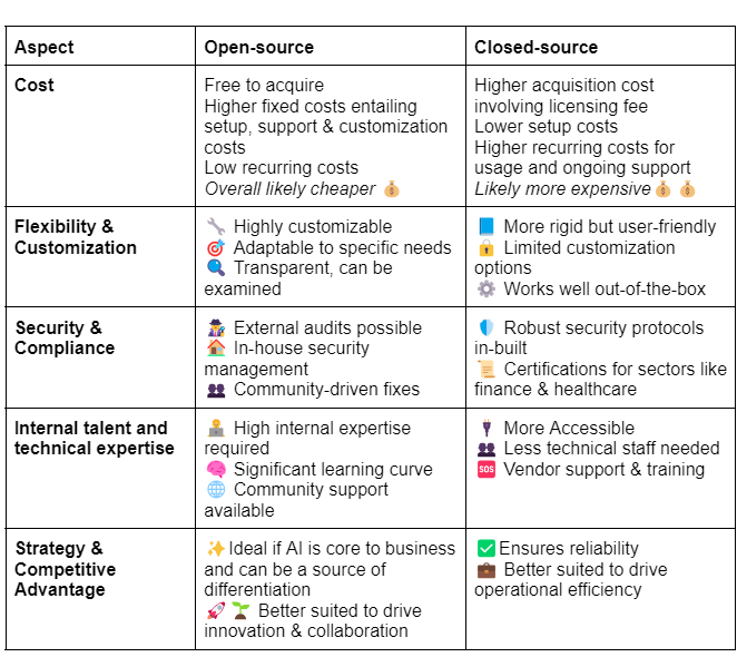 Enterprises opting to buy AI solutions externally must also decide between open-source or closed-source (proprietary) tools, models, and algorithms. Open-source solutions offer base models with open licenses, allowing for greater flexibility and control. This empowers users to adapt and integrate these tools into various systems with ease. In contrast, most closed-source solutions involve licensing access to proprietary models owned by the vendor. While these offer less freedom to modify or adapt, they are often considered to be of higher quality—though this gap is narrowing.